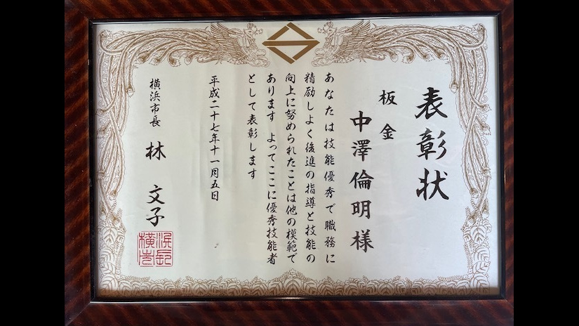 中澤板金の代表、中澤倫明は横浜市から優秀技能者として認められました。板金技術、技術指導など全てにおいて模範となる技能者として表彰され、丁寧な作業と明るいお客様対応など、作業を安心して任せられる中澤板金です。